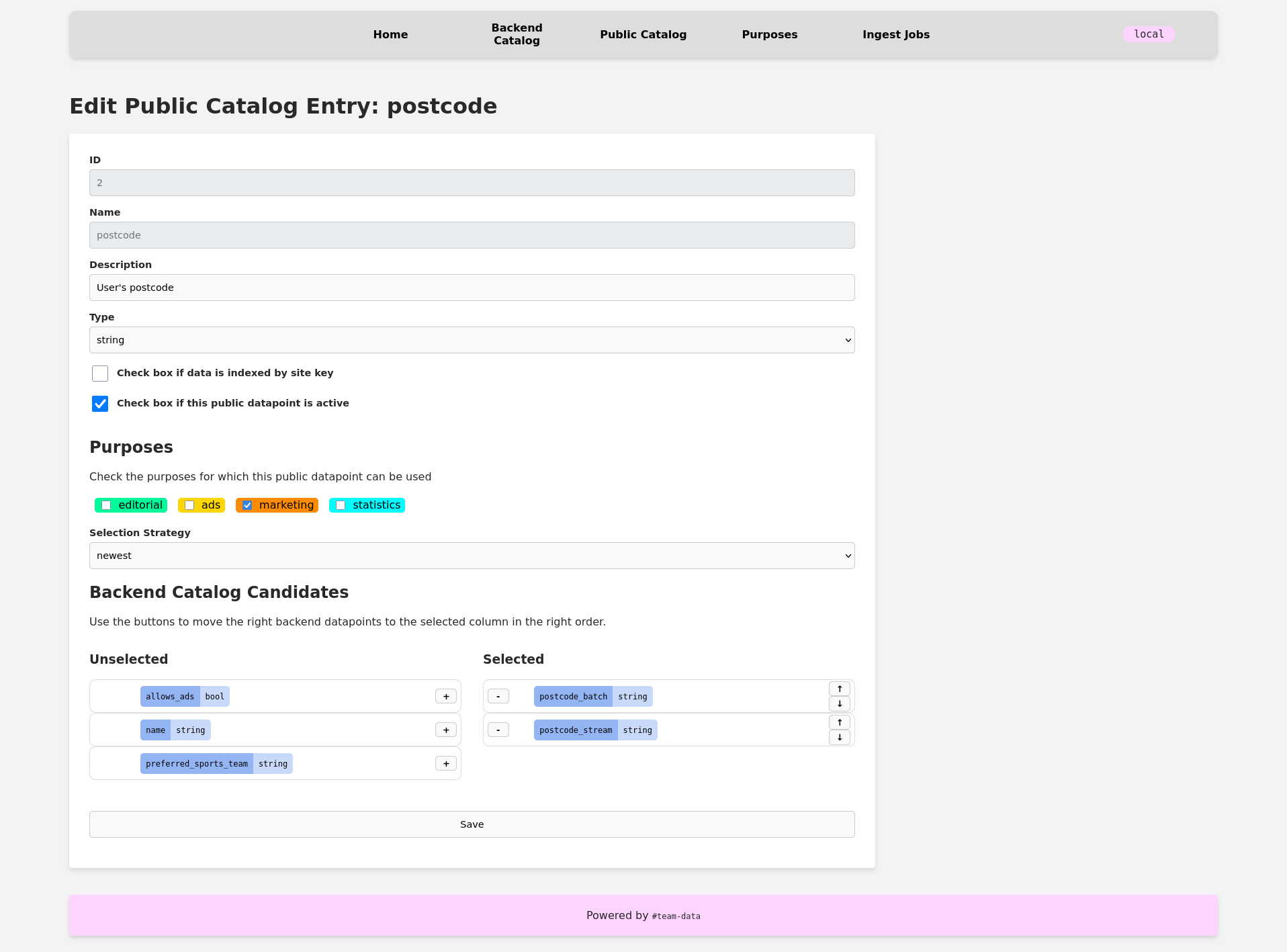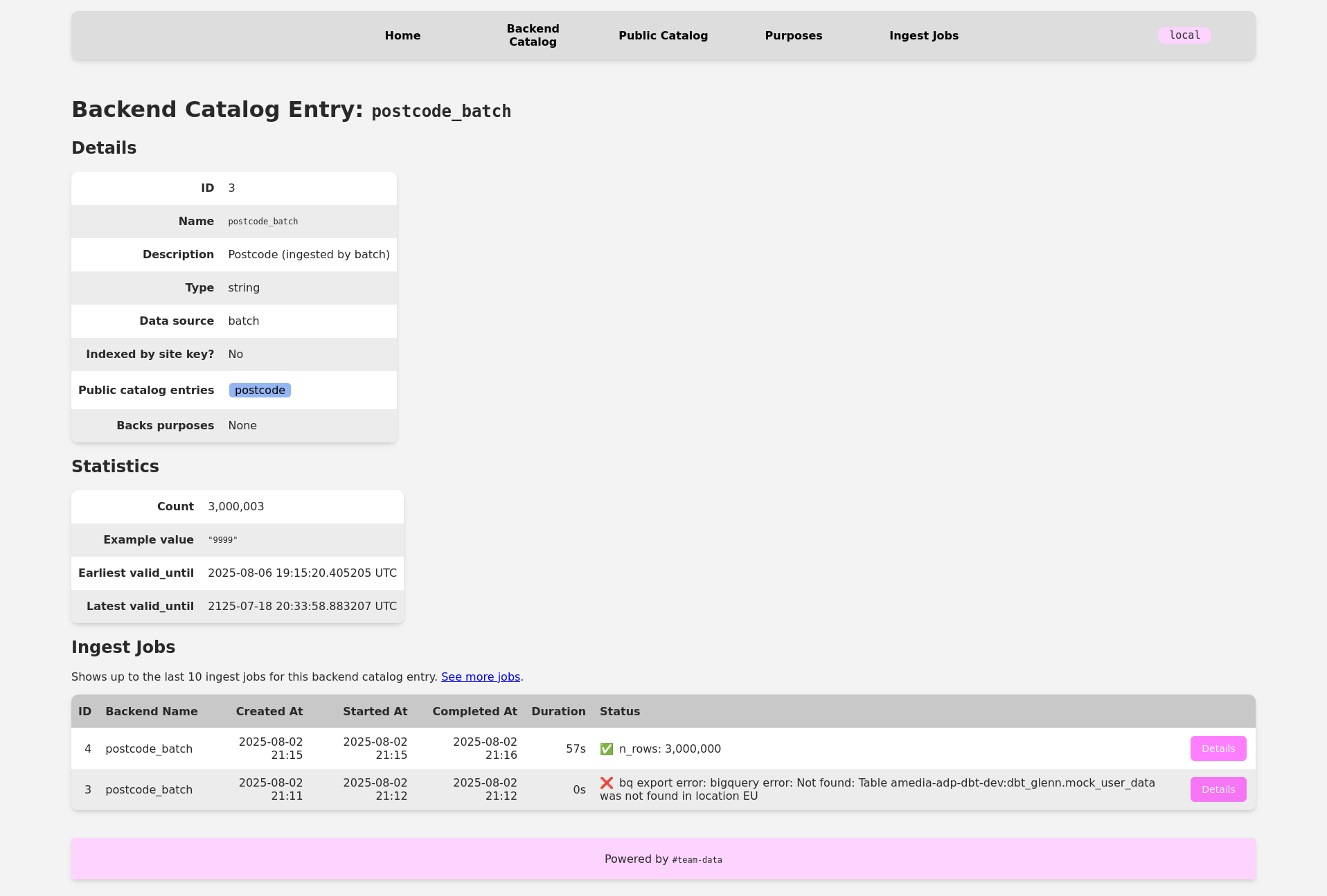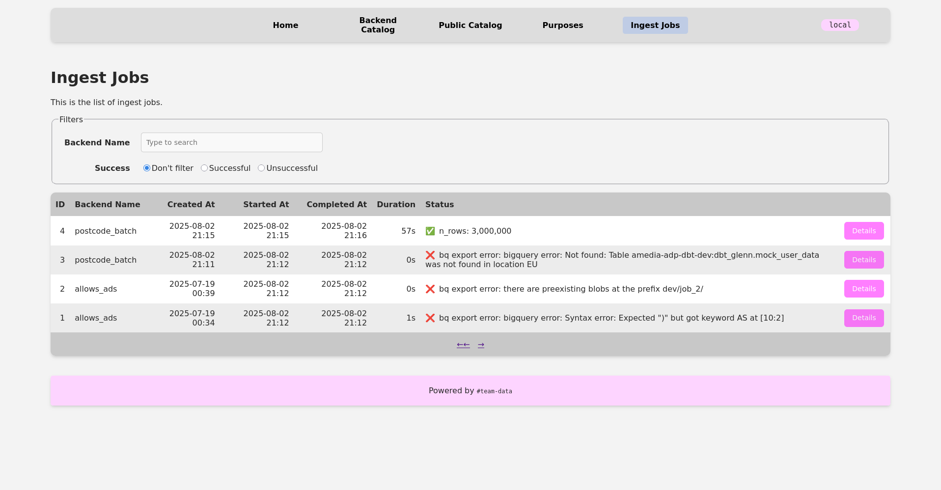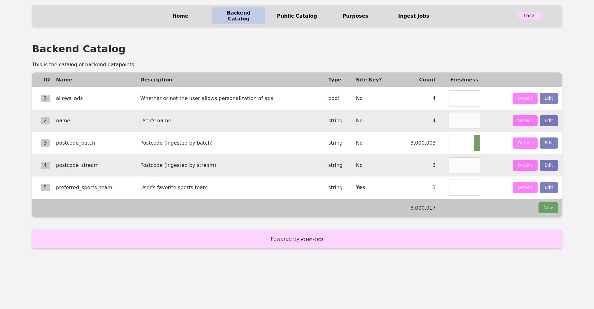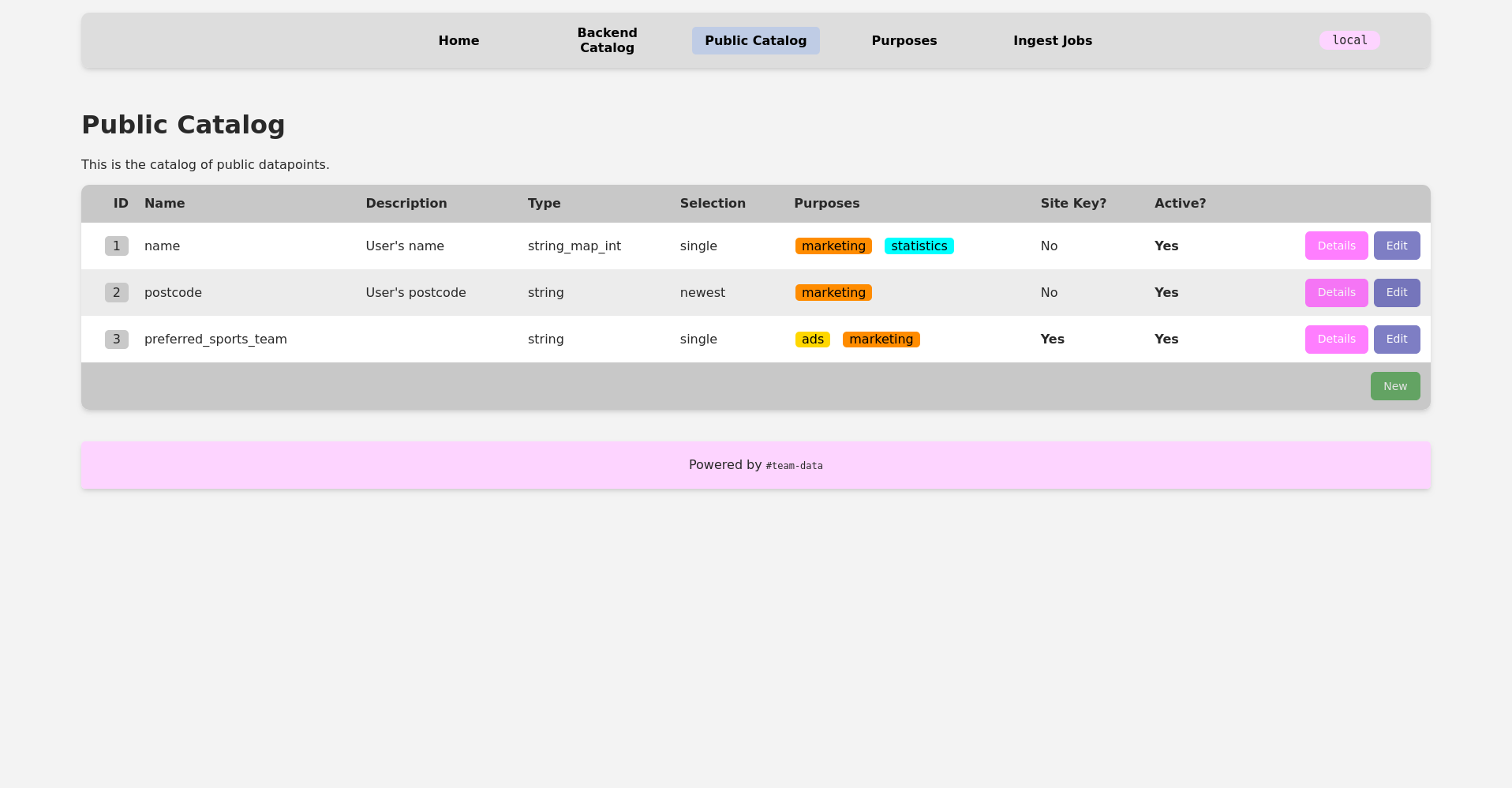 The dashboard has list pages for the physical and virtual attribute catalogs, purposes, and ingest jobs. Each attribute entry has a detail page and an edit page. Each purpose can also be edited, and each job has a detail page. It’s also possible to add new attributes via the dashboard. Every developer in our organization can view all data, but only data platform developers can POST to the edit and new endpoints.